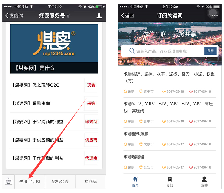 为了让大家能够把更多的精力放在其他工作上,煤婆服务号微信的“关键词订阅”功能上线啦!成功订阅之后,只要有符合您要求的货物产品订单发布,微信服务号将自动向您发送提醒,方便您一整天都可以合理安排时间。
